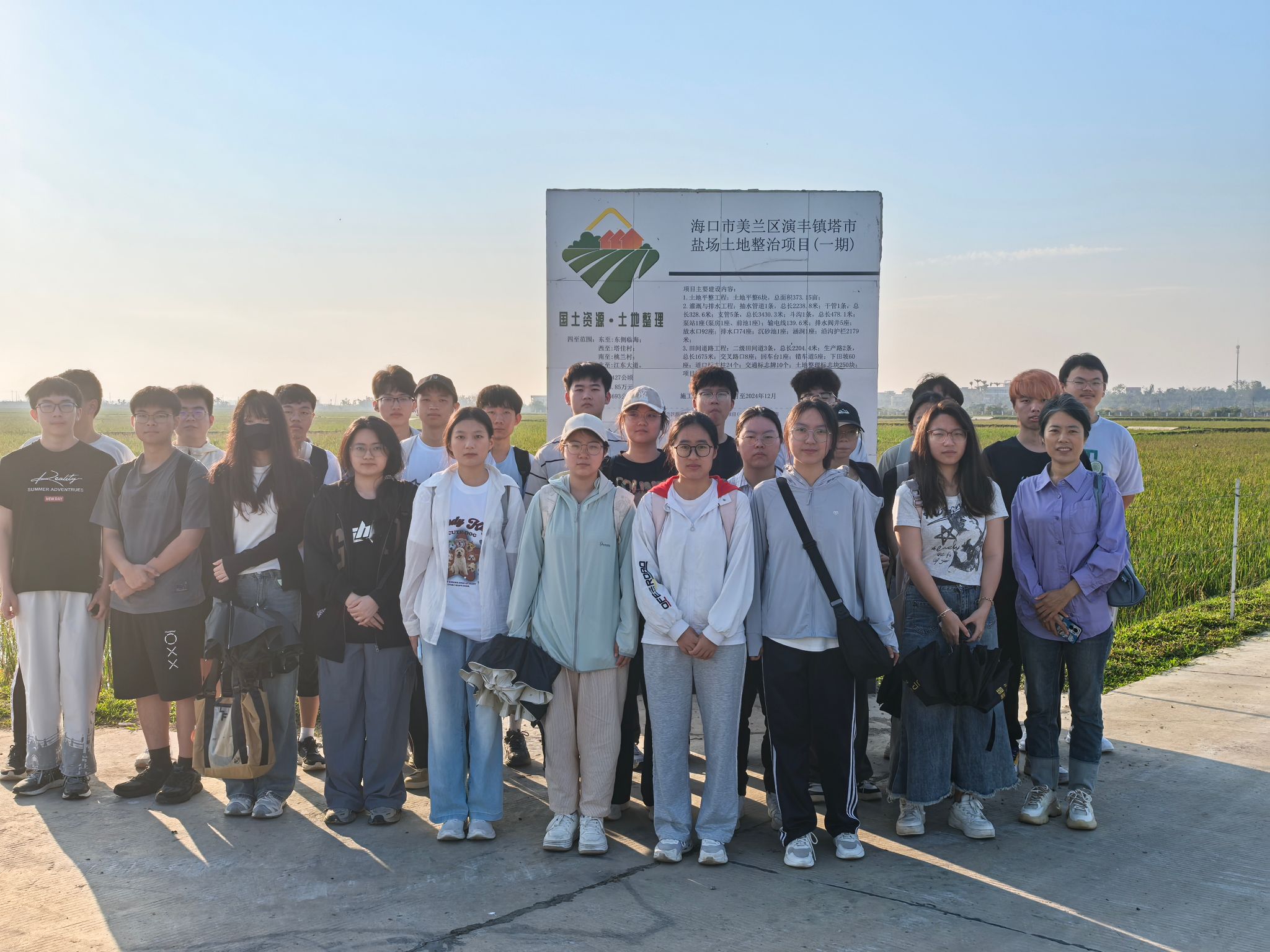 作为海南省土地综合整治示范工程,该项目通过土地平整、灌溉排水系统优化及田间道路建设等系统性工程,将盐渍化滩涂改造为标准化农田,为本次土地调查提供了很好的素材。调研伊始,宋晓丽副教授结合项目展板向员工介绍了项目概况、外业调查的内容、要求及任务,引导大家“带着问题观察,结合理论思考”,为外业工作做好了充分准备。
