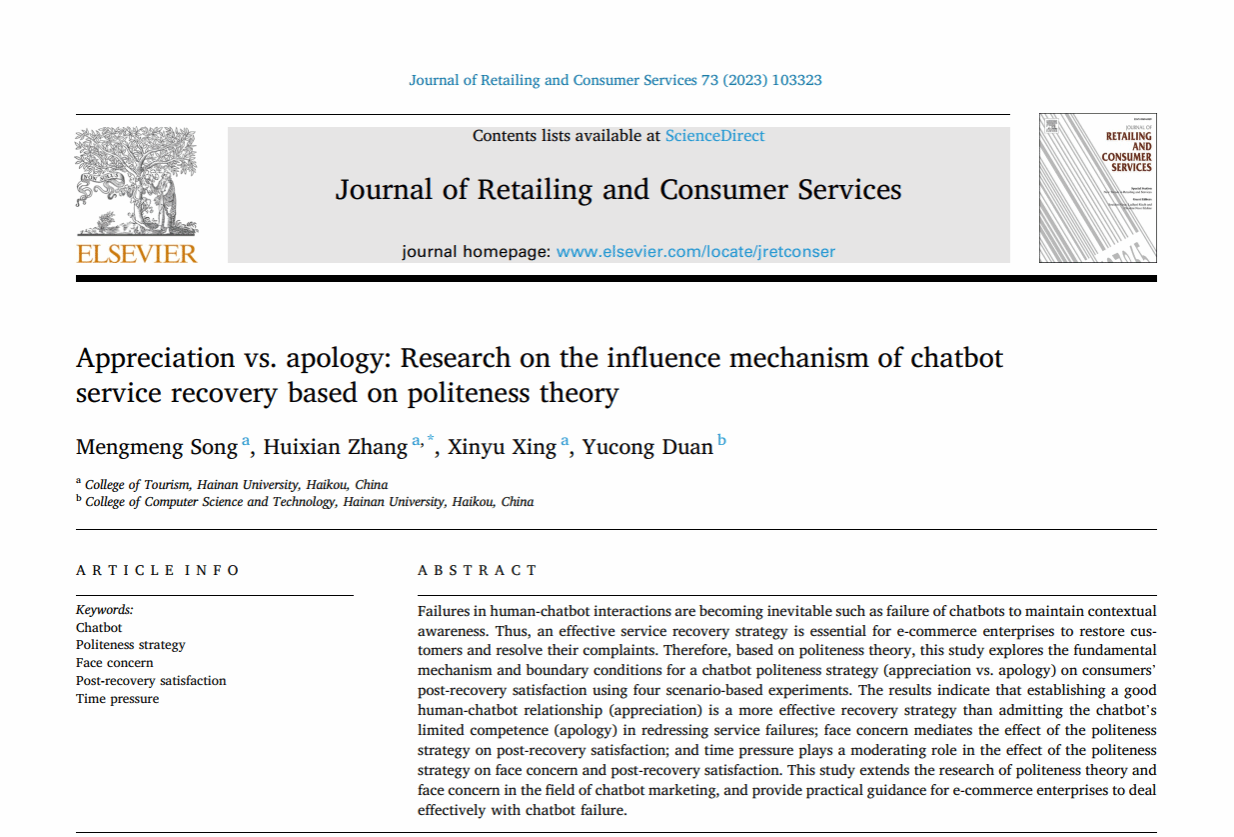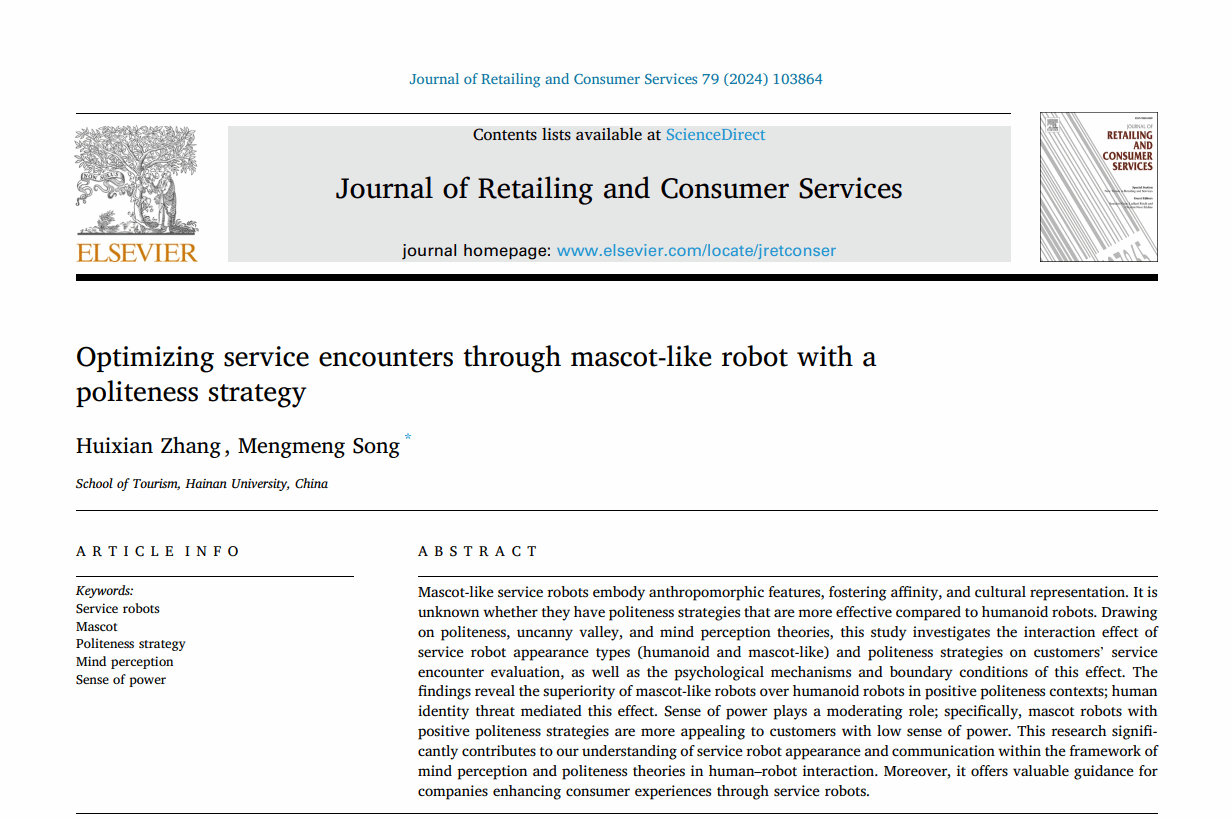 关于服务机器人的论文“Optimizing service encounters through mascot-like robot with a politeness strategy”于2024年4月在线发表,第一作者为硕士生张慧娴,通讯作者为宋蒙蒙副教授。关于在线聊天机器人的论文“Appreciation vs. apology: Research on the influence mechanism of chatbot service recovery based on politeness theory”于2023年7月发表,第一作者为宋蒙蒙副教授,通讯作者为硕士生张慧娴。两篇论文均以bw必威西汉姆联官方网站为唯一署名单位。