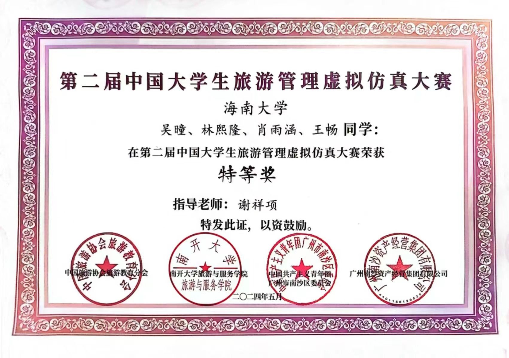 经过初赛和决赛的激烈角逐,吴曈团队(成员:吴曈、林熙隆、肖雨涵、王畅;指导老师:谢祥项)获虚拟仿真大赛特等奖;卢章健团队(成员:卢章健、徐京群、陈宇坤、缑瑜;指导老师:谢祥项),朱娇娇团队(成员:朱娇娇、张子怡、童靖茹、石建青;指导老师:侯佩旭)、黄娜团队(成员:黄娜、黄依雯、刘依思娜、孙玉琼;指导老师:雍天荣)以及卜云龙团队(成员:卜云龙、胡文静、谢开昕、彭子轩;指导老师:李萍)分别获虚拟仿真大赛二等奖;卢章健团队(成员:卢章健、徐京群、陈宇坤、缑瑜;指导老师:谢祥项)作品获全域游打卡短视频挑战大赛二等奖。