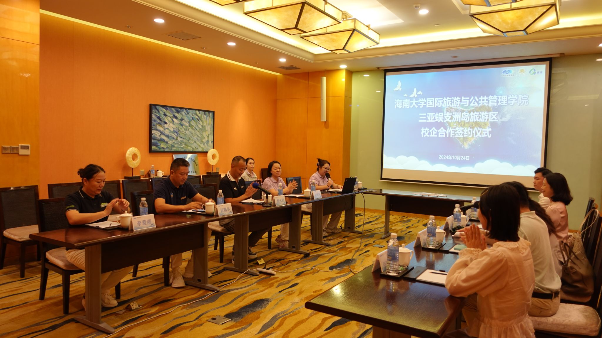 10月24日,公司执行经理徐艳晴、党委副书记欧少红、副经理何彪、综合办主任周超凡、科研助理匡晓芳一行前往三亚蜈支洲岛旅游区签署院企合作协议并举行挂牌仪式。三亚蜈支洲岛旅游区副总裁鲍永洲、商业管理总监陈燕冬、酒店运营总监李慧丽、人力资源部经理陆锦华等出席并参与座谈。