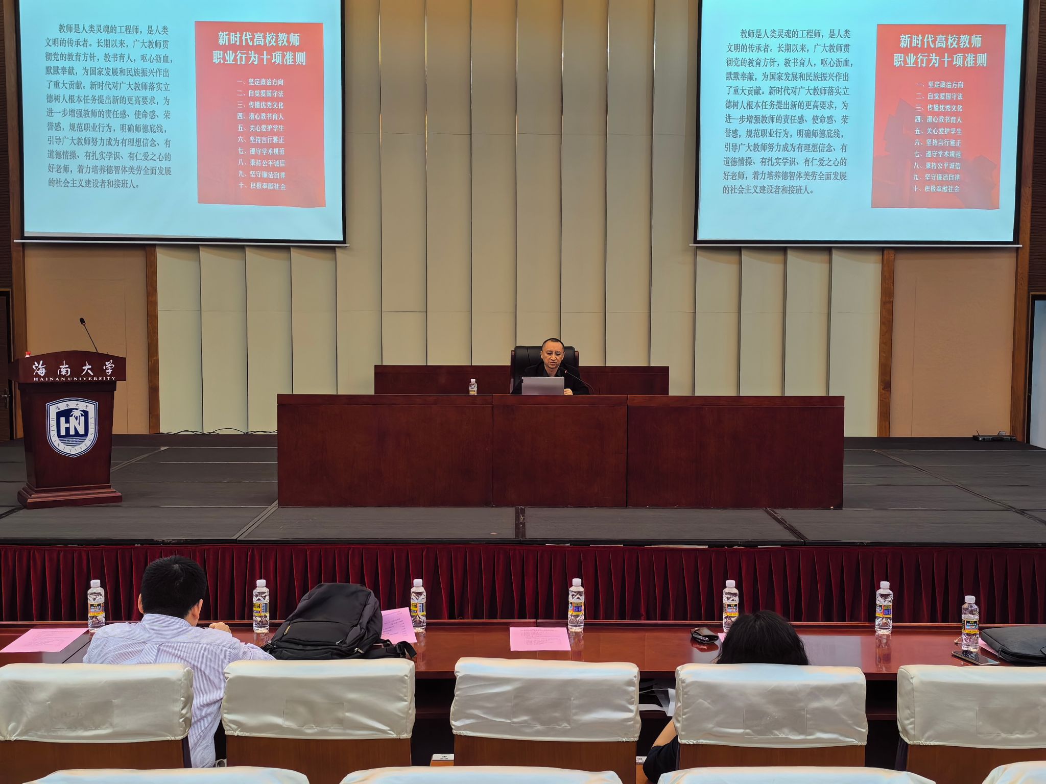 会议第一阶段,党委书记郭强向全体教师讲授师德师风开学第一课,主题为“守教育初心,筑师德底线”。郭强书记结合习近平总书记关于师德师风的重要论述,带领全体教师重温《新时代高校教师职业行为十项准则》,结合教育部曝光的违反高校教师职业行为十项准则典型案例以及公司、公司工作实际进行深入解读,规范职业行为,明确师德底线,引导广大教师时刻自重、自省、自警、自励、自觉,进一步增强教师教书育人的责任感和使命感。