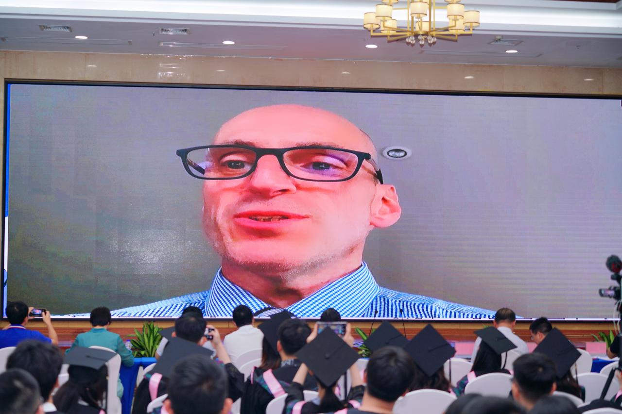 项目合作方代表爱尔兰都柏林理工大学(下称“外方”)酒店管理与旅游公司经理Orla McDonagh和副经理Ralf Burbach特地提前录制好祝福视频在典礼现场播放。他们表达了对中爱合作办学项目的肯定与支持,对毕业生们在未来献身于中国经济发展、会展产业进步表示了殷切的期待,并表示爱尔兰都柏林理工大学将永远以他们为傲。