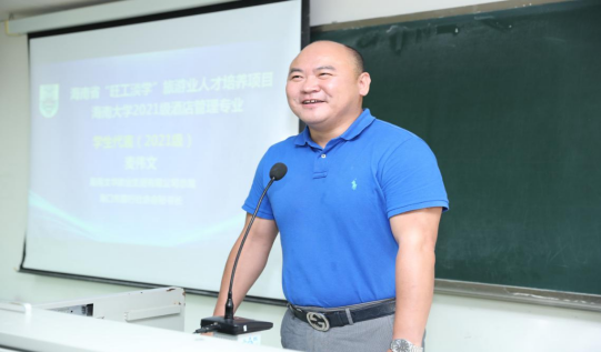 接着,由2020级总经理班班长,海南君华海逸酒店总经理方权作为老生代表发言。他分享了自己在项目学习中的四大收获。他表示,“旺工淡学”项目为海南省旅游行业从业者提供了一个良好的提升学历与技能的通道,希望学员克服工作与学习上的时间冲突,在学习过程中不断摸索体会,真正做到学以致用。