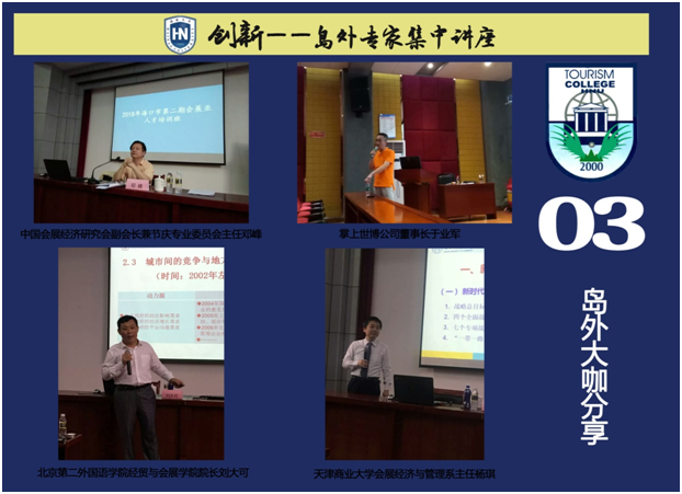 此外,为使员工们能够进一步开拓视野,耿松涛教授还针对岛外知名的专家学者采取了集中式的讲座邀约,邀请到中国会展经济研究会副会长兼节庆专业委员会主任邓峰博士、北京第二外国语公司经贸与会展公司经理刘大可教授、天津商业大学公共管理公司副经理杨琪副教授、掌上世博公司董事长于业军等大咖为员工带来不同主题的分享。