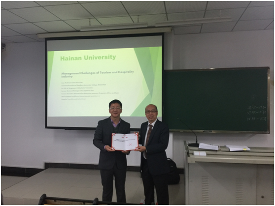 2019年1月6日-1月10日,马来西亚南方大学公司副董事长陈秀林教授应邀来公司,为2017级酒店管理专业的本科生开展冬季小学期授课。授课开始前,旅游公司副经理王永强亲临教室,对陈秀林教授的到来表示热烈欢迎,并举行了简短的聘任仪式。