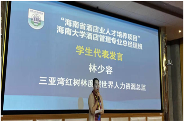 教师代表发言后,由本次总经理班员工代表,三亚市三亚湾红树林度假酒店人力资源总监林少容女士发言。林女士首先代表全体学员向省教育厅、文体厅、省旅游饭店协会以及bw必威西汉姆联官方网站旅游公司表达了感谢,同时也表示自己非常珍惜这次重回校园、自我提升的机会。