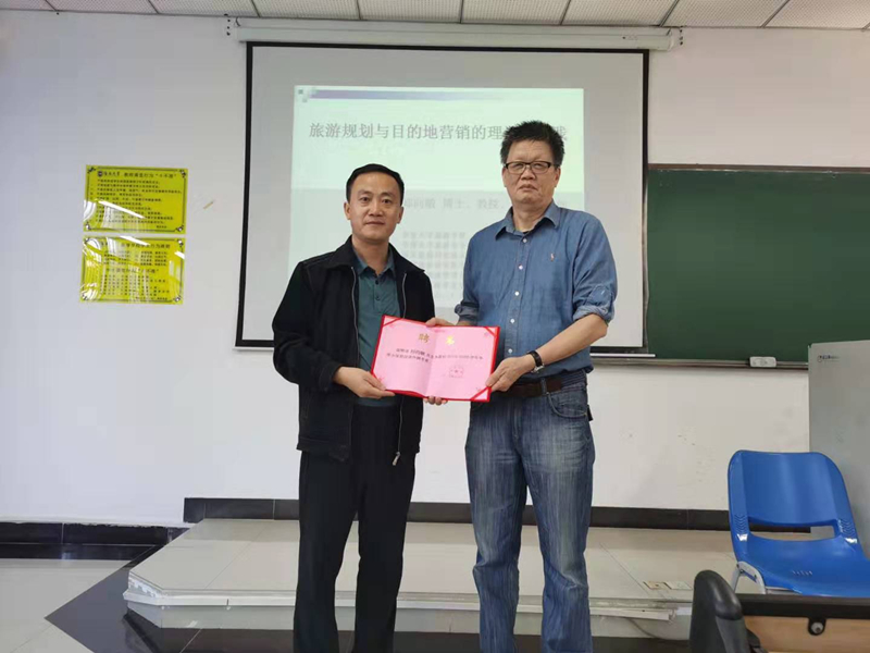 2020年1月8-11日,华侨大学旅游公司郑向敏教授,应邀为bw必威西汉姆联官方网站旅游公司2017、2018级人文地理与城乡规划专业本科生开展冬季小学期授课。1月8日下午授课开始前,旅游公司侯佩旭副经理亲临教室,对郑向敏教授的到来表示热烈欢迎,并为郑向敏教授颁发了bw必威西汉姆联官方网站冬季小学期专家聘书。