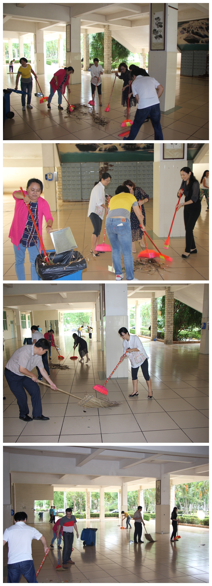 台风过后,针对教学楼内杂物堵塞等问题,经理韦开蕾、公司党委书记韩淑梅,及时召集公司教工党员开展灾后环境卫生清理工作,及时清扫公司内外的树叶、断枝、杂物等,恢复公司环境干净整洁,保障了正常的教学工作秩序。