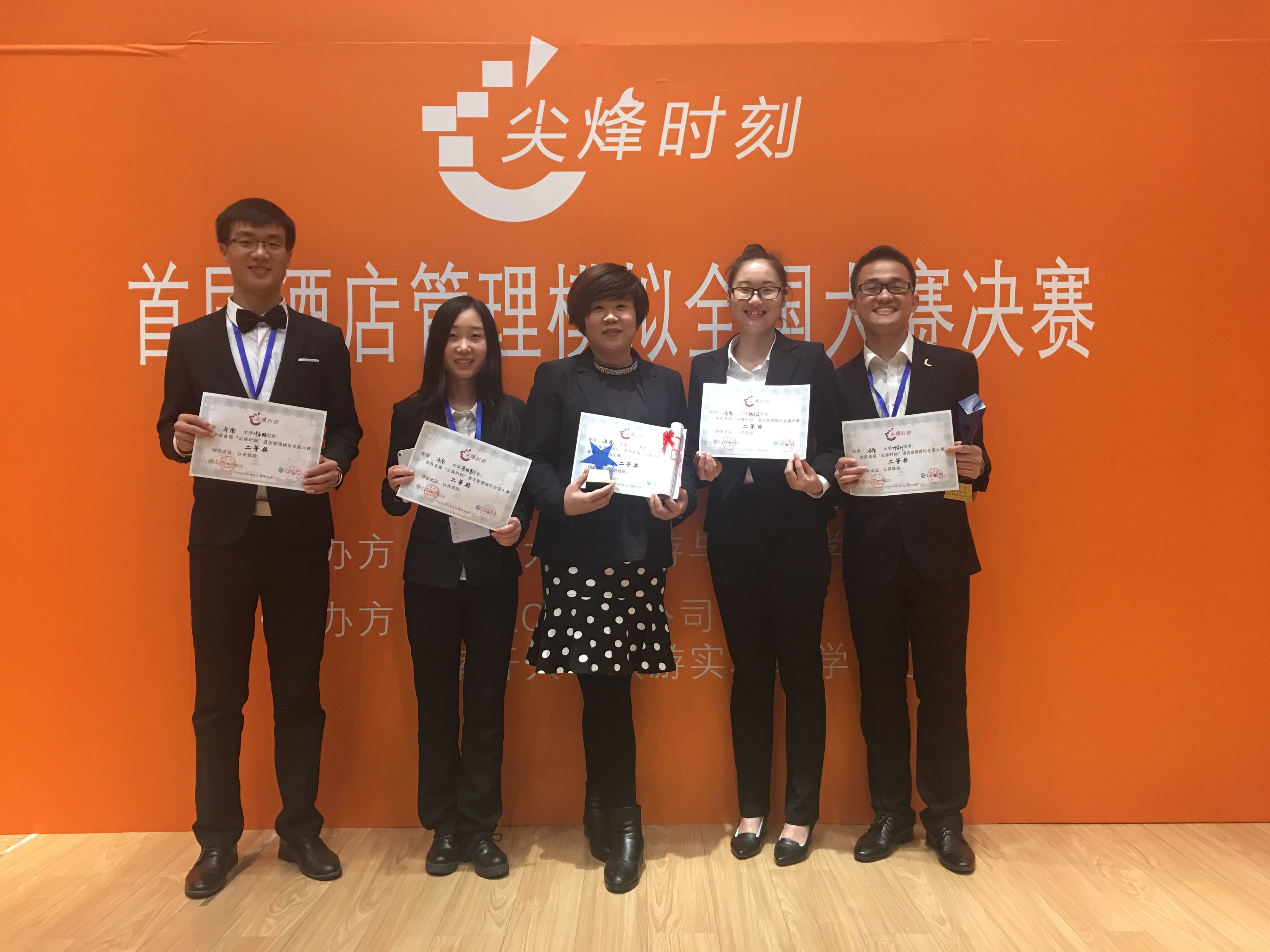 12月13日—15日,首届“尖烽时刻”酒店管理模拟大赛全国总决赛在南开大学举行。公司2014级酒店管理专业的叶永胜、叶宝升、潘妍荣、殷秀停四名本科生组成的“海之队”团队在本次比赛中荣获二等奖,团队指导教师王婷婷老师荣获优秀指导教师奖。