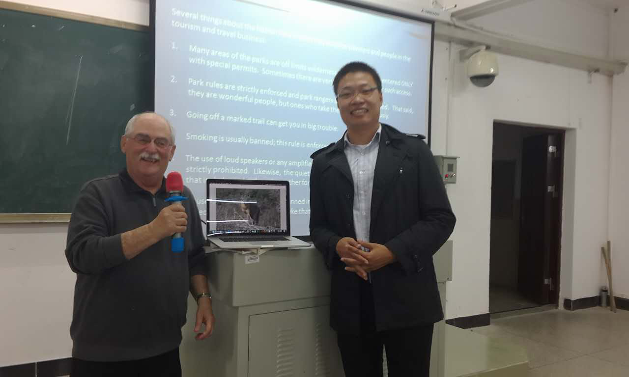 为提升本科生公司产品质量,增进公司与国外高校的交流和联系,受公司旅游管理系老师潘志新的邀请,2017年2月23-26日,美国加州州立大学(洛杉矶分校)地理系教授John Kirchner来公司讲学。结合公司旅游管理类本科专业课程,2017年2月24日晚,Kirchner教授分别在海甸、城西校区开设了一场以“美国内华达山脉的国家公园”为主题的讲座。