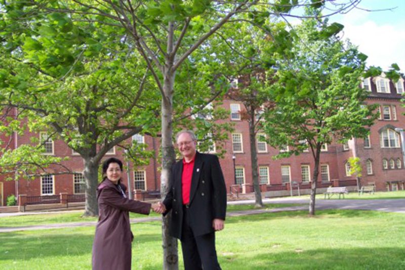 爱德华王子岛大学韦德董事长与杨红老师(左)亲切握手