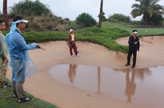开球仪式结束后,比赛正式在观澜湖玖号球场展开角逐,采用一轮18洞个人比杆赛和团体比杆赛相结合的比赛方式,以总杆数决定最终名次。比赛当日,受到冷空气影响,海口风雨交加,大风伴着时不时的暴雨,增加了比赛的难度,更加考验了球员的实力发挥和精神意志。即使天公不作美,但所有的球员和工作人员都真正地发扬了高尔夫精神,秩序井然,诚信自律,不急不躁。尽管在狂风大雨中都已疲惫不堪,但是球员们意志坚定,坚持不懈地打完了所有球洞。所有的工作人员坚守岗位,有效合作保证比赛有序进行。
