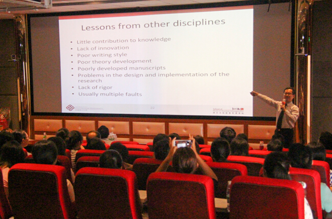 本次讲座主题是:Publishing in Research Journals。讲座内容主要分为两个部分:论文写作和审稿人拒稿原因。Rob Law教授从期刊的选择、标题设置、摘要写作、数据分析、图表设置以及参考文献、语法问题、稿件修改等方面阐述了投稿一篇论文所需注意的问题;从投稿论文的结构问题和内容问题分析了审稿人拒稿的原因,其中论文结构问题包括研究方法、样本、研究意义、写作质量以及逻辑性等方面的问题,论文内容问题包括论文的某些重要部分、文献回顾、分析、讨论与结论、参考文献、期刊特殊要求等方面的问题。Rob Law教授讲座内容结束后,胡涛副经理、宋子斌副教授表均达了自己深刻感受与对Rob Law教授的感激之情,并组织进行了提问环节,公司老师和同学都争先向Rob Law教授提问,同时Rob Law教授进行了耐心详细的解答。讲座于11:30顺利结束,让公司师生均受益匪浅。