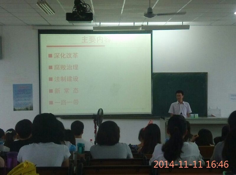 进行党课第一项,全体起立,奏唱《国际歌》。在慷慨的音乐之后,进行党课第二项,范士陈老师开讲了。范老师就现今的热点问题讨论进行教学。以“深化改革”、“腐败治理”、“法制建设”、“新常态”、“一带一路”五点作为主线,讲解现今中国的内部现状和外部情况。讲“深化改革”后才是中国真正的“新常态”,而这两点将会是中国国内更为“干净”,会为下一次的腾飞做好准备。“腐败治理”的核心是军队,之后会从军事上突破美国的封锁,而“一带一路”将在经济上突破。而这几项的进行须有法制的保障使其实施。所以“法制建设”也是必不可少的内容。范老师用通俗幽默的语言进行了本次课程,全堂课同学们的注意力都极为集中。最后李春莹同学就本次党课进行简单的总结,再次强调上课时的纪律,要求同学们严格遵守。