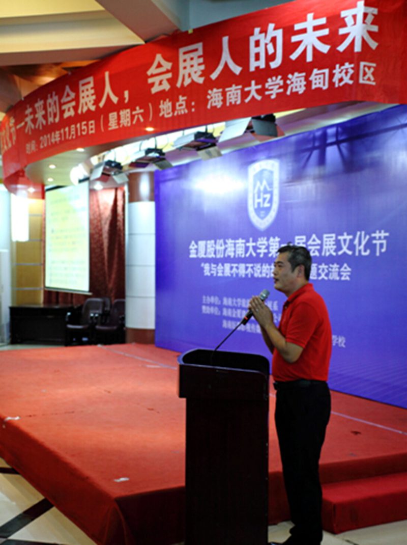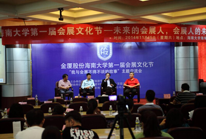 在随后的主题交流会中,海南金厦建设股份有限公司总经理李彤、海口市会展协会会长杨学功、海南开启会议接待有限公司总经理王俊刚分别就“成功源于专注”、“我与会展”和“我的会展之路”进行主题演讲,与在场师生分享心得体会。在对话交流环节,同学们就各自感兴趣的问题向现场的老师和专家提问,“你认为现在中国的会展业存在什么问题?”、“海南发展会展产业的优势有哪些?”、“会展专业的就业方向都有哪些?” 活动交流现场气氛非常热烈。