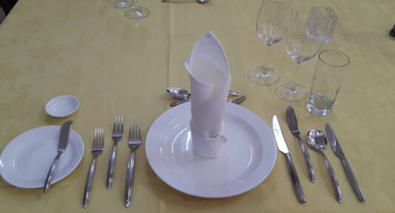 明黄的桌布、闪亮的酒杯、整齐的刀叉、高高的烛台、洁白的口布……这就是首届公司开放日系列活动之一“西餐宴会摆台”展示区,也号称“最美展区”!来自海口新燕泰大酒店的西餐服务员小符向同学们认真讲解西餐宴会摆台的基本流程和注意事项,从铺台布到定位、从主盘到刀叉摆放、从沙拉刀叉到牛排刀叉、从面包盘到酒杯、从调料器具到装饰烛台、从整体布局到器皿间距……一步一步的讲解,一招一式的示范,让大家了解了西餐宴会摆台的基本流程,也让大家了解了看似简单的摆台还是个“技术活”,需要耐心、细心和诚心为宾客创造美妙的就餐环境。小符的讲解赢得了热烈的掌声,同学们拿出手机拍照,大家已经喜欢上这种“技术活”。