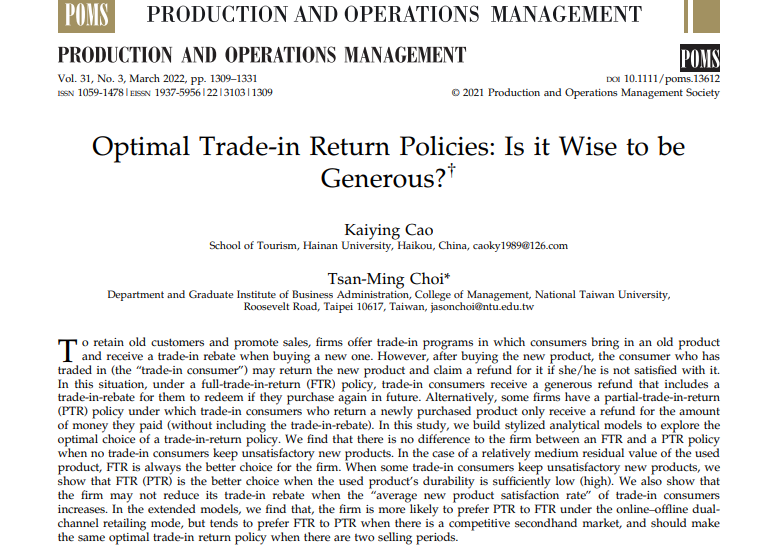 论文通讯作者为Tsan-Ming Choi教授(台湾大学),曹开颖教授为第一作者。论文首次探究以旧换新服务退货问题,为以旧换新和退货两大研究领域构建桥梁,并为现实中耐用品企业制定以旧换新退货策略提供指导借鉴。