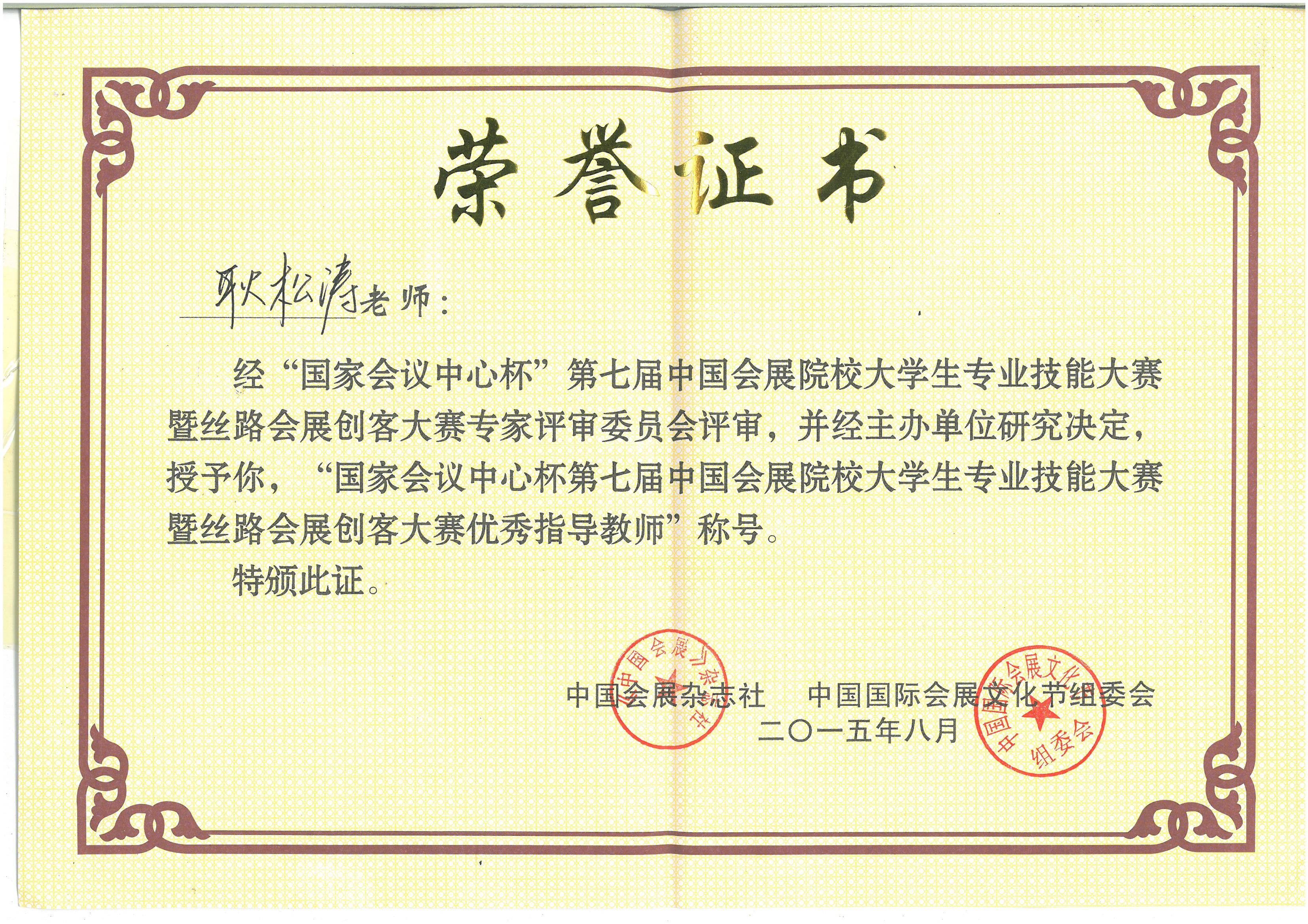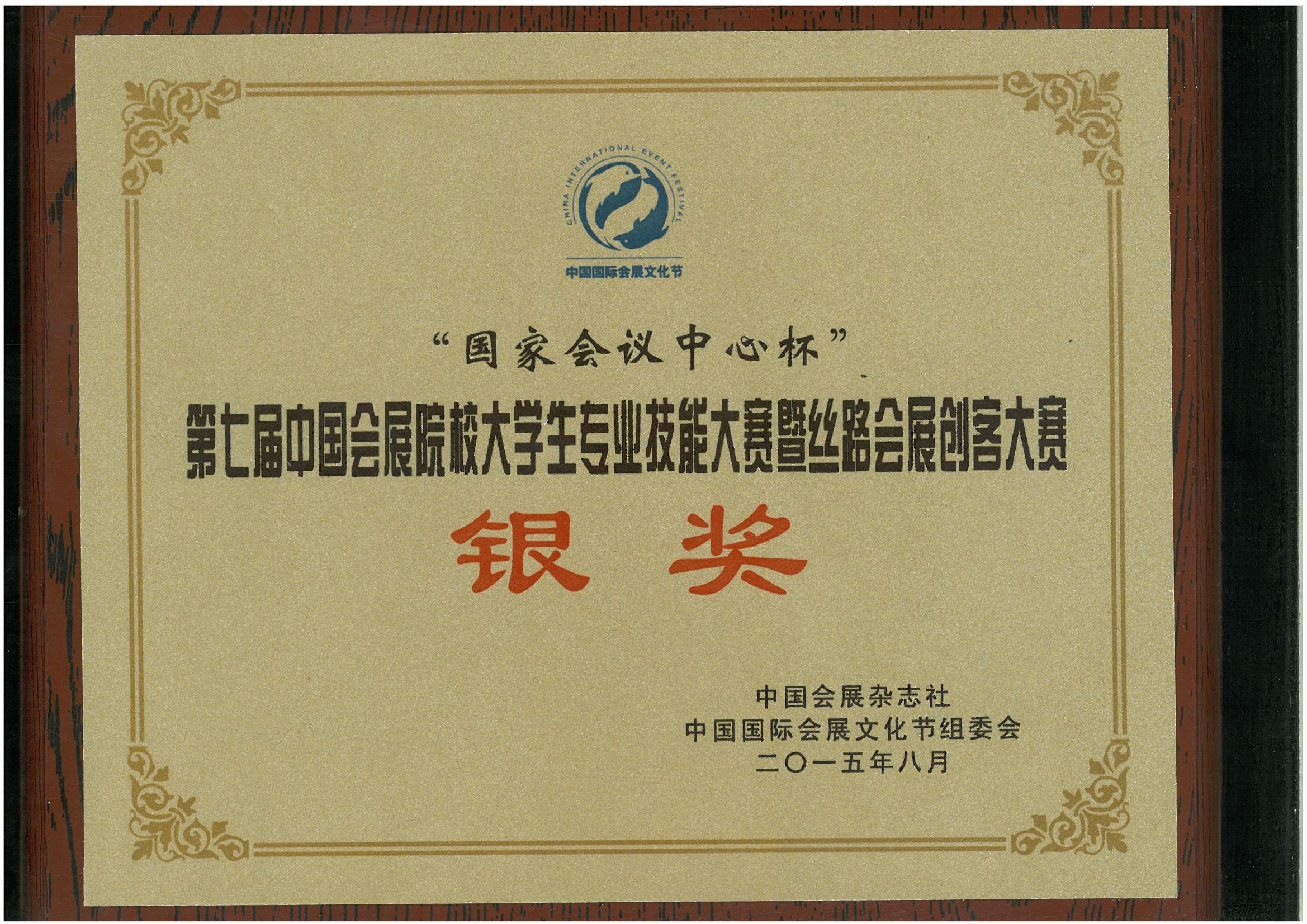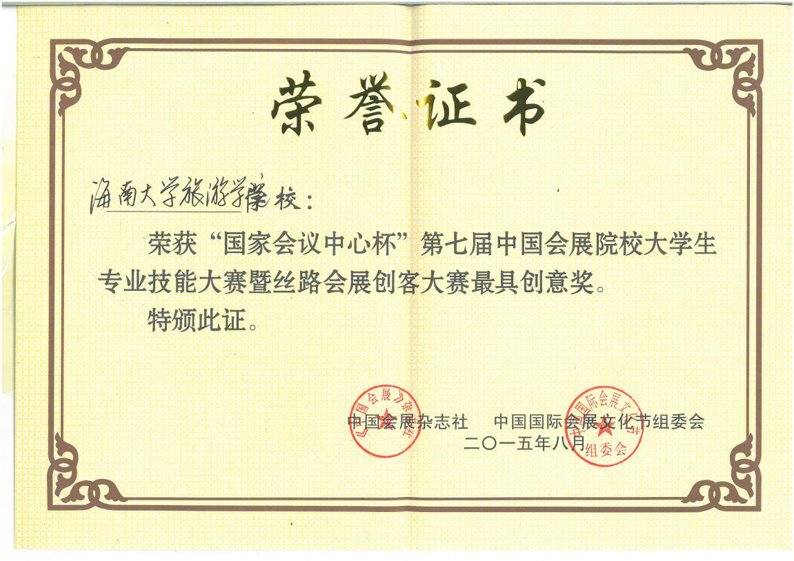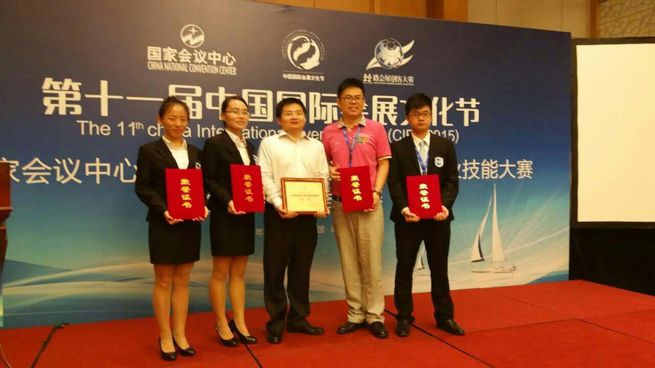 继2014年bw必威西汉姆联官方网站旅游公司代表队在“第六届中国会展院校老员工专业技能大赛”中取得金奖,2015年bw必威西汉姆联官方网站旅游公司代表队再创佳绩,在“第七届中国会展院校老员工专业技能大赛暨丝路会展创客大赛”中荣获银奖和本届大赛组委会设置的唯一一个方案单项奖项——最具创意奖。同时,2012级会展经济与管理班华志兵、史源、焦晓文同学荣获“中国老员工会展活动策划师”称号,指导老师耿松涛副教授再一次获评“优秀指导教师奖”殊荣。