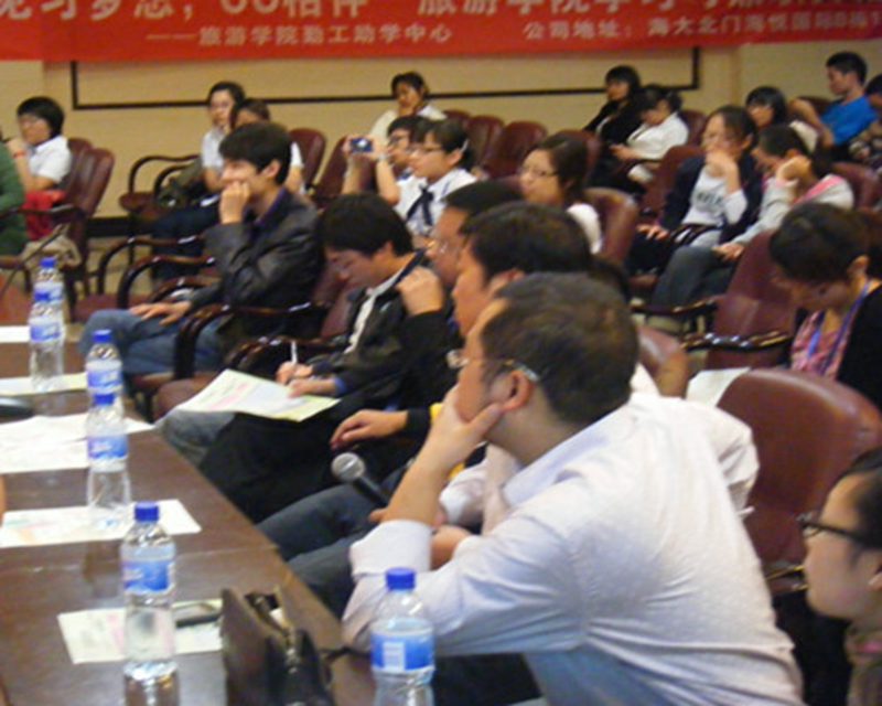 大会以勤工助学中心成员的合唱开始,一首激昂的《我相信》唱出了他们青春的无悔、青春的激情!大学是一个锻炼自我的舞台,我努力、我拼搏、我上进,只因为我相信。在接下来的“超级访问环节” ,嘉宾对大家提出的各种“尖锐”的问题都做了合理而又颇有见地的回答,如“在员工员工的学习与工作发生冲突时,你是希望他们好好工作还是半途辞职”这一问题,书香海韵旅行社总经理杨卫平不仅以“学习为主工作为辅”为中心展开了自己巧妙的回答,还向同学们提出了宝贵的建议,同时各位优秀的学长则根据自己在大学所积累的经验对“兼职对以后的就业有何影响” 、“如何做出正确的大学规划和抉择”等问题以及就学习与兼职的谈话发表了宝贵的意见和建议。而本次交流会最大的亮点“职来职往”生动地模拟现实生活中的面试场景,志愿者回答嘉宾提出的面试问题,在考验了他们的临场应变能力的同时也展示了自己的智慧,此外,嘉宾还给同学们传授了许多难能可贵的面试技巧。
