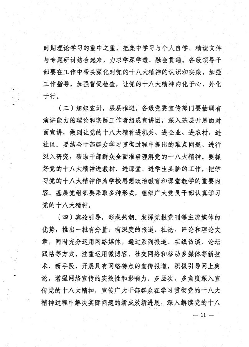 要在深入学习和深刻领会党的十八大精神的同时,加大党的十八大精神的宣传力度,通过校园网、宣传栏、校报、广播站等校内宣传阵地和海南日报、海南电视台、人民网、新华网、中新网等省内主流媒体以及中央驻琼媒体,大力宣传党的十八大精神的主要内容和精髓实质,宣传公司党员干部和广大师生学习贯彻党的十八大精神的积极行动和显著成效。要充分发挥哲学社会科学专家学者的积极作用,组织专家宣讲团在校内外开展各种形式的十八大精神宣讲活动,撰写发表理论宣传文章,帮助师生和社会各界深刻理解党的十八大精神的精髓实质,切实增强走中国特色社会主义道路、丰富中国特色社会主义理论体系、完善中国特色社会主义制度的自觉性和主动性。通过宣传教育和舆论引导,真正做到让十八大精神进头脑、进教材、进课堂,真正深入到师生心中,融入到师生的工作学习之中。