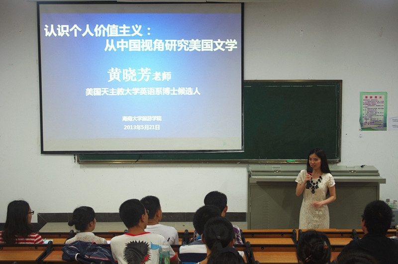 5月21日下午,美国天主教大学博士候选人黄晓芳老师带来了题为“认识个人价值主义:从中国视角研究美国文学”的英语学术讲座。旅游公司、外国语公司部分师生及其他公司师生到场聆听。黄老师使用大量多媒体资料,从对比“中国梦”和“美国梦”开始,讲解美国文化“个人价值至上” 的核心价值观,并且和大家分享自己正在进行的研究。到场师生纷纷用英语踊跃提问,黄老师耐心地一一解答,气氛热烈。