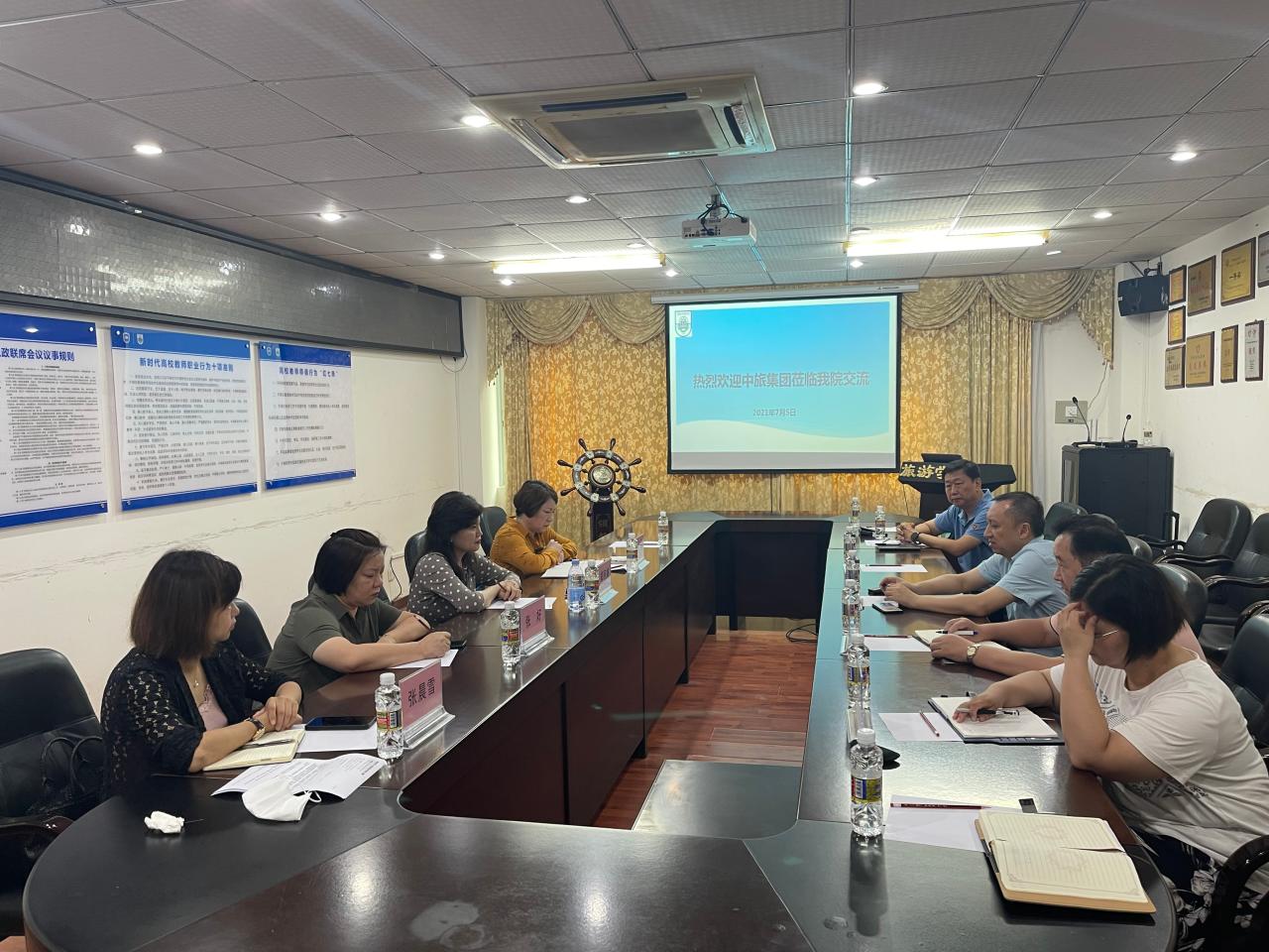 2021年7月6日上午,中国旅游集团旅行服务有限公司副总经理郑丽娟、中旅旅行(海南)有限公司总经理张好、中旅国际会议展览有限公司副总经理刘艳、张晨雪一行到访公司交流。旅游公司郭强经理、旅游管理系袁国宏主任等老师在公司会议室接待来访的客人并参加座谈。