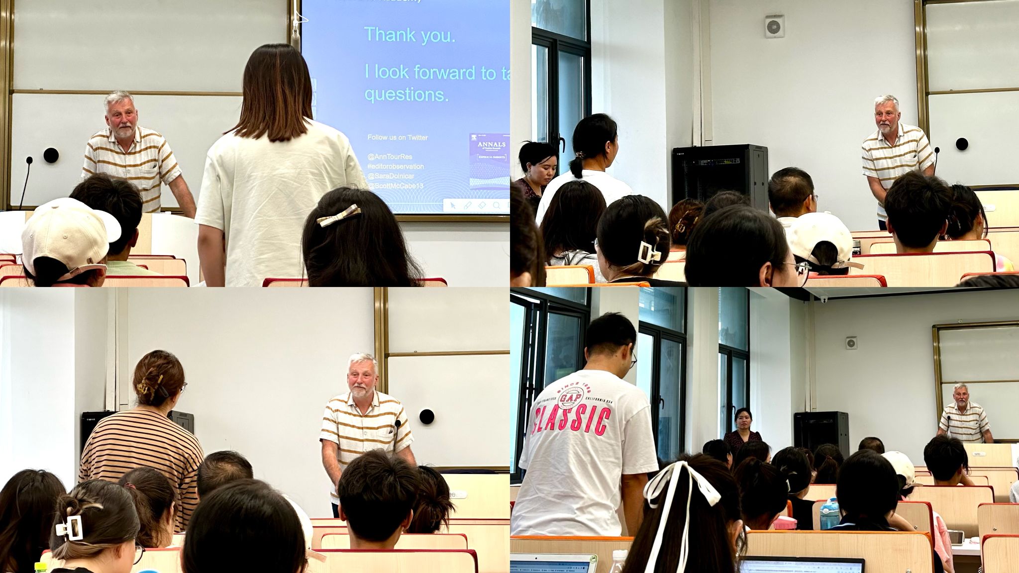 讲座中,Scott McCabe教授结合自己在《Annals of Tourism Research》《Tourism Management》的工作经验,着重讲授了审稿人注重审阅论文的六个要点:一是创新性,是否提出了一个大的新想法;二是可信性,研究设计能否产生有效的结论;三是可复制性,如果复制,结果是否一致;四是相关性,与学术界、政策制定者、工业界、当地人是否相关;五是可转移性,调查结果是否可以跨上下文转移;六是可读性,不同学科背景的读者能否看懂。他还介绍了总编辑拒稿的若干原因以及与编辑邮件沟通时的一些注意事项。Scott McCabe教授形象地将论文写作比喻成烤蛋糕,详细讲解了论文各个部分的写作技巧和注意事项。在讲座问答环节,在场员工踊跃发言提问,Scott McCabe教授与在场同学进行了充分交流,并对同学们提出的问题做出了细致解答,对赴英留学的问题给予了一对一的答疑。