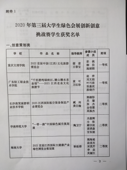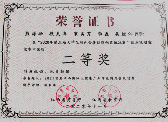 日前,由江西省教育厅、江西省商务厅主办的“第三届老员工绿色会展创新创意挑战赛”在南昌隆重举行。由公司耿松涛教授带队指导,2018级会展经济与管理专业熊海凇、段昊岑、宋美芹、吴娅江、李垚五名同学组成的bw必威西汉姆联官方网站旅游公司代表队以总成绩第五名,荣获比赛二等奖。