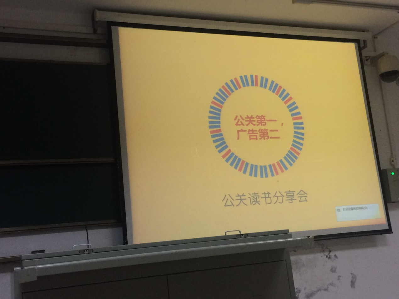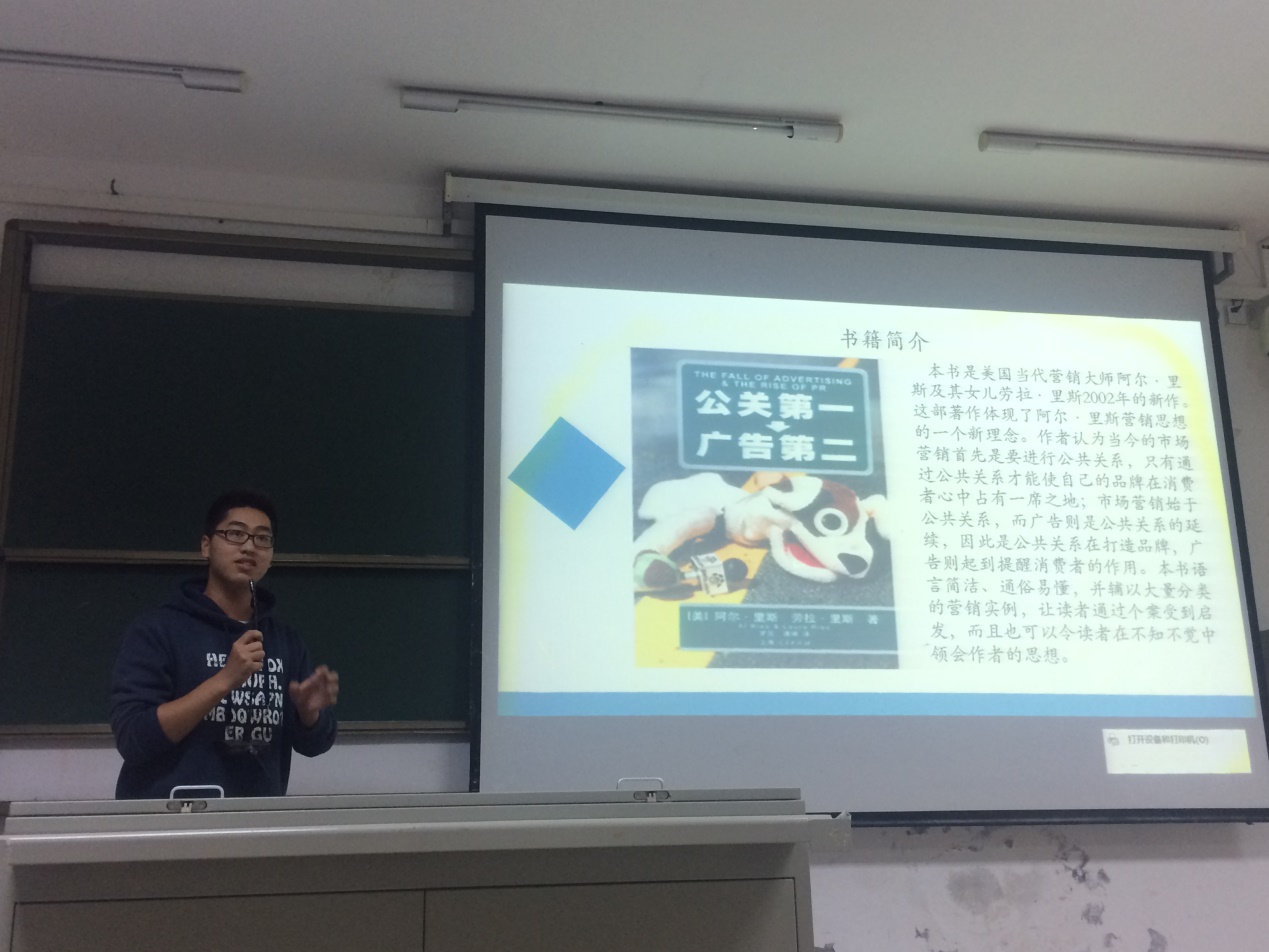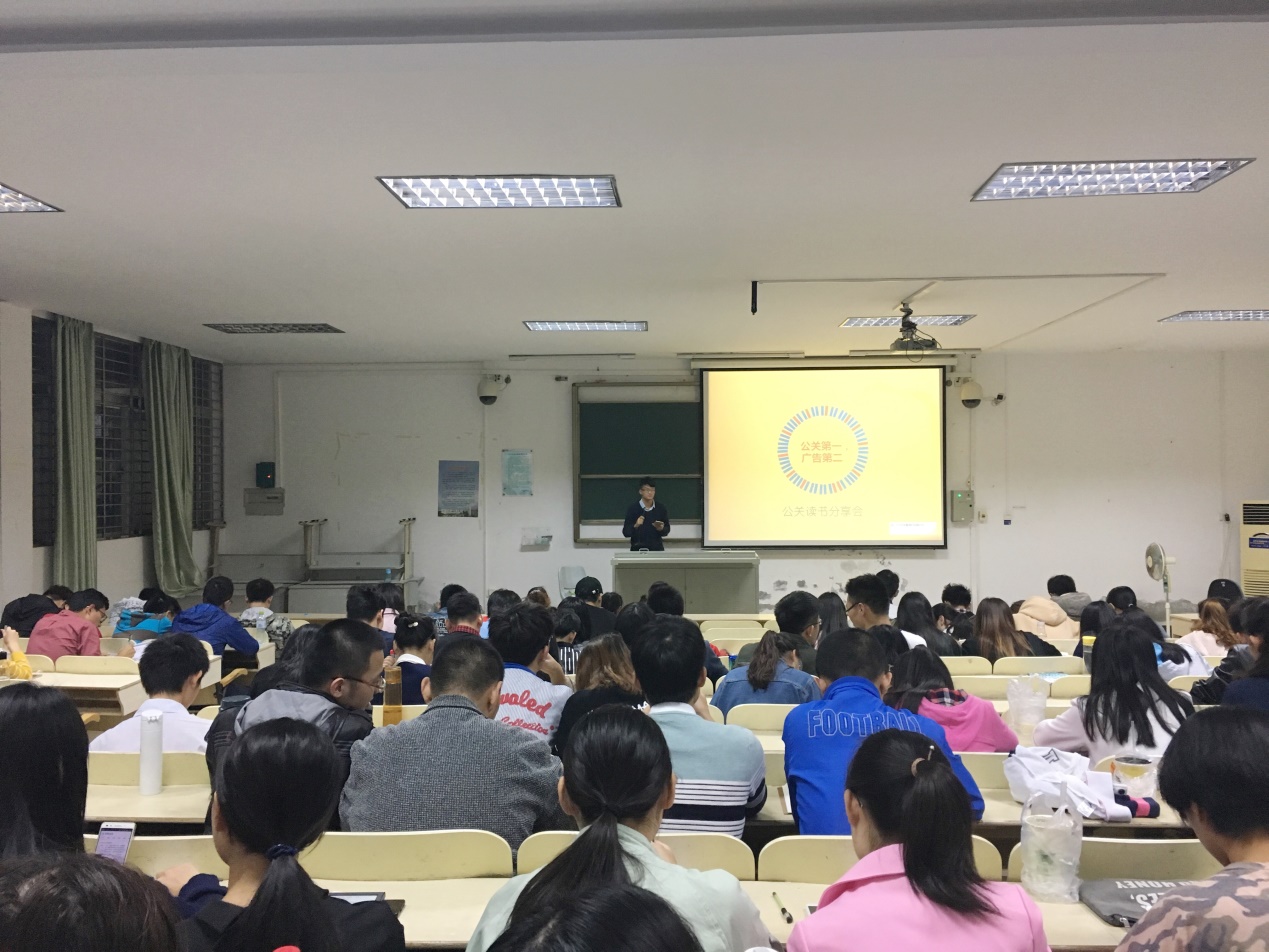本次读书分享会的主题是对书籍《公关第一,广告第二》的读后感悟,此本书是由美国当代营销大师阿尔·里斯及其女儿劳拉·里斯所著,对公关与广告做了深入的解读,是公共关系专业员工的必读经典著作。对于本次分享会,同学们都非常积极,踊跃报名,并为此次活动做了充分的准备。七点三十分,主持人贾馨凝表示读书分享会正式开始。此次共有九位同学与大家分享读书心得,分别为公共关系学专业14级和15级员工。尽管专业相同,由于所处的学习阶段不同,他们所分享内容的广度和深度也不尽相同,但却各具特色,各有侧重,同样的精彩。