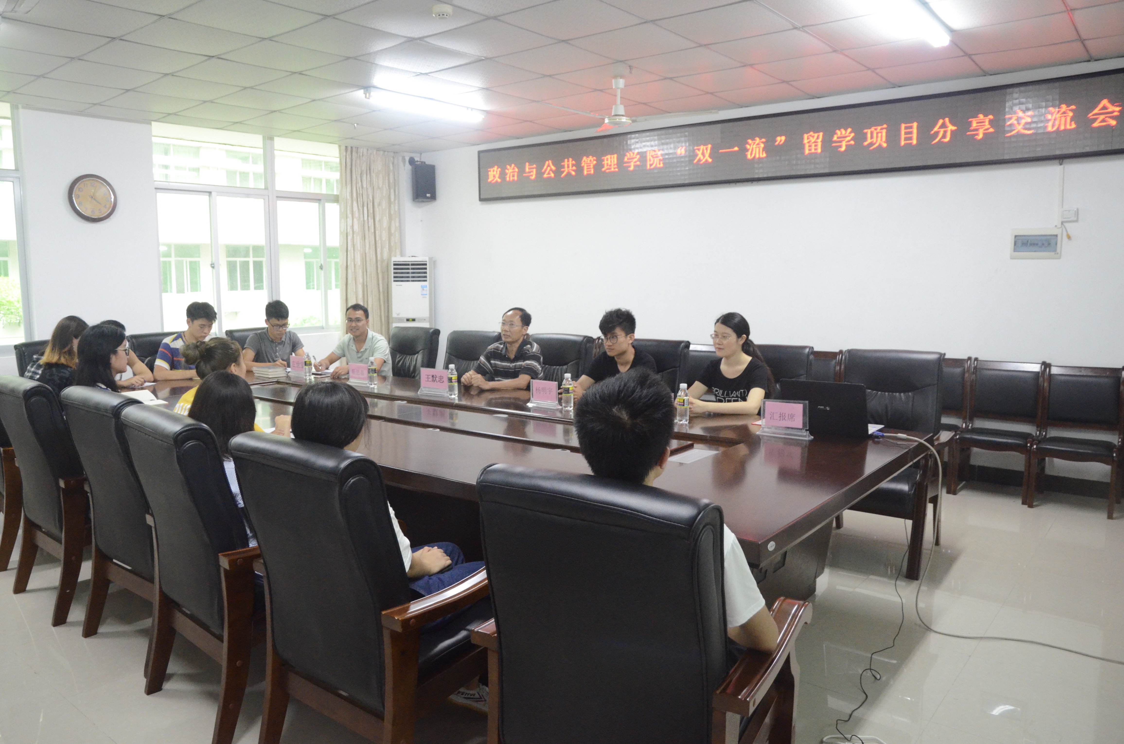 6月14日下午,政治与公共管理公司“双一流”留学项目交流分享会在社科楼A213举办。孙睿、杨明宇、靳思嘉三位获公司“双一流”留学项目资助的同学受邀作分享交流。公司党委书记王默忠、辅导员左世宝老师及公司有意向出国留学的10余位同学参加了分享会。