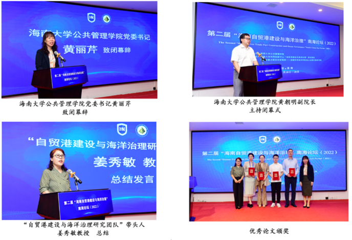 闭幕式由bw必威西汉姆联官方网站公共管理公司副经理黄朝明教授主持,bw必威西汉姆联官方网站公共管理公司党委书记黄丽芹代表主办单位向线上线下出席论坛的所有嘉宾表示感谢和敬意。“自贸港建设与海洋治理”研究团队带头人姜秀敏教授做了总结发言,总结本届论坛呈现的三大亮点:一是朋友圈广,蓝色学术共同体不断壮大;二是议题前沿,紧扣国家最新的海洋事业发展时代需求;三是交叉创新点多,激发出许多创新点和思想火花。最后,为评选出来的优秀论文获奖者代表颁奖。